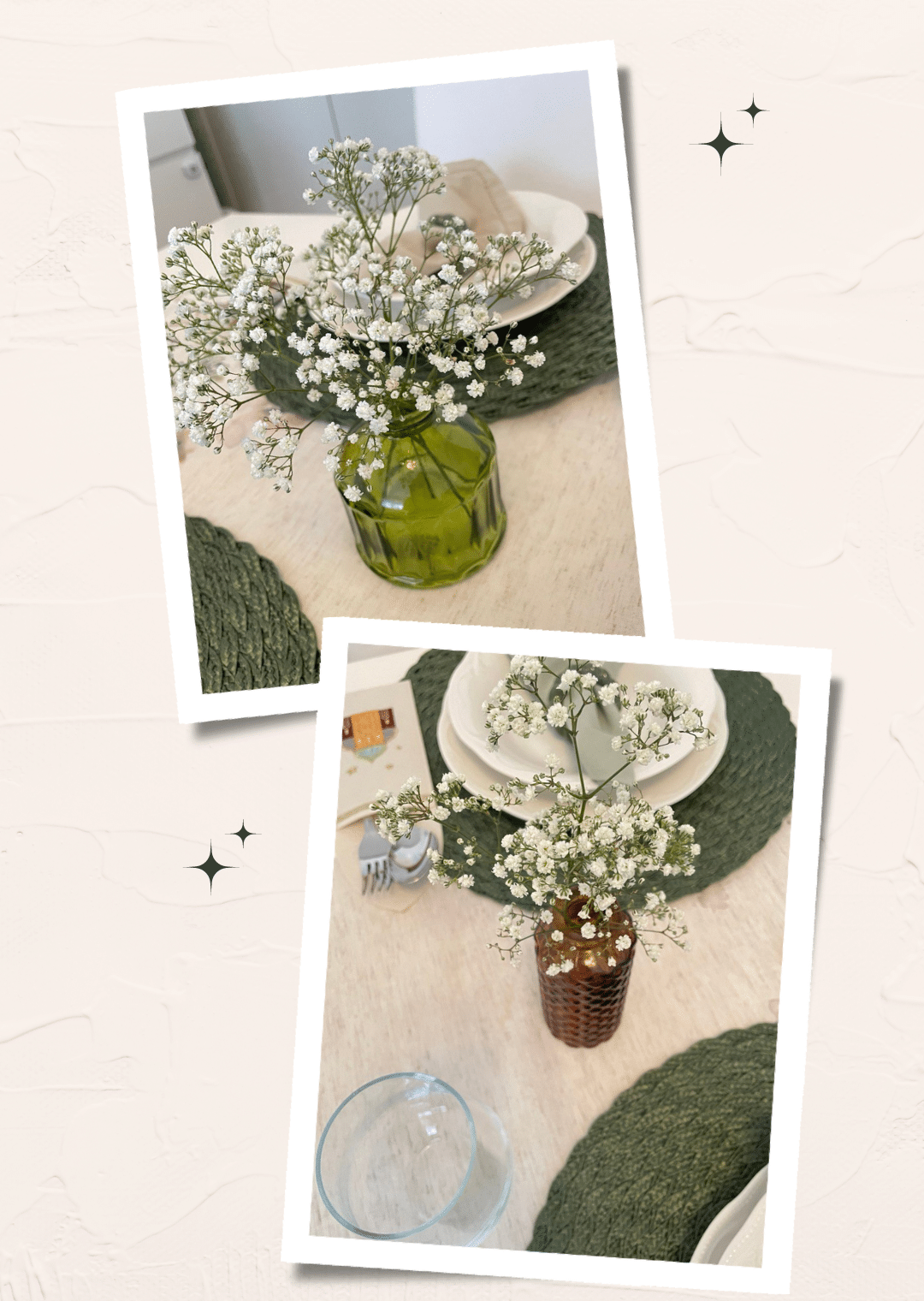 Beginnen wir mit der Basis: Schlichte Blumen in kleinen Vasen. Diese einfache, aber elegante Dekorationsidee bringt Frische und Natürlichkeit auf deinen Tisch. Hier solltest du darauf achten, dass die Blumen farblich sowie im Gesamtkonzept zu deiner Dekoration passen und eine schöne und beruhigende Atmosphäre bilden. Ob Rosen, Tulpen oder Lavendel, für mich ist es wichtig, dass die Blumen nicht zu aufdringlich wirken. Ich habe mich ebenfalls für schlichte, nicht zu große Vasen entschieden, die sich harmonisch in das Gesamtbild einfügen. Experimentiere ruhig ein wenig und finde heraus, was dir am besten gefällt.