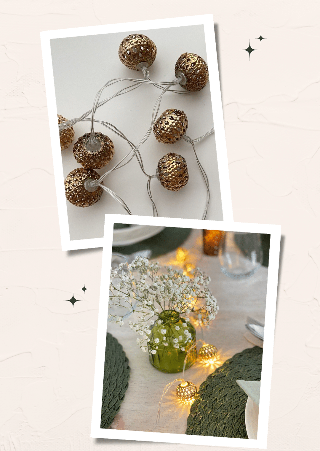 Eine sorgfältig ausgewählte Lichterkette, die zum Thema Ramadan passt, kann deinem Tischdekor eine warme und einladende Atmosphäre verleihen. Sie hebt die anderen Elemente hervor, ohne zu überwältigen.