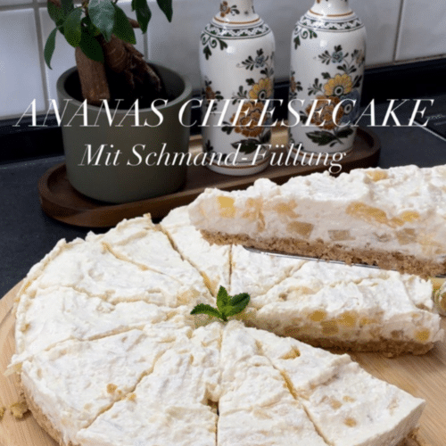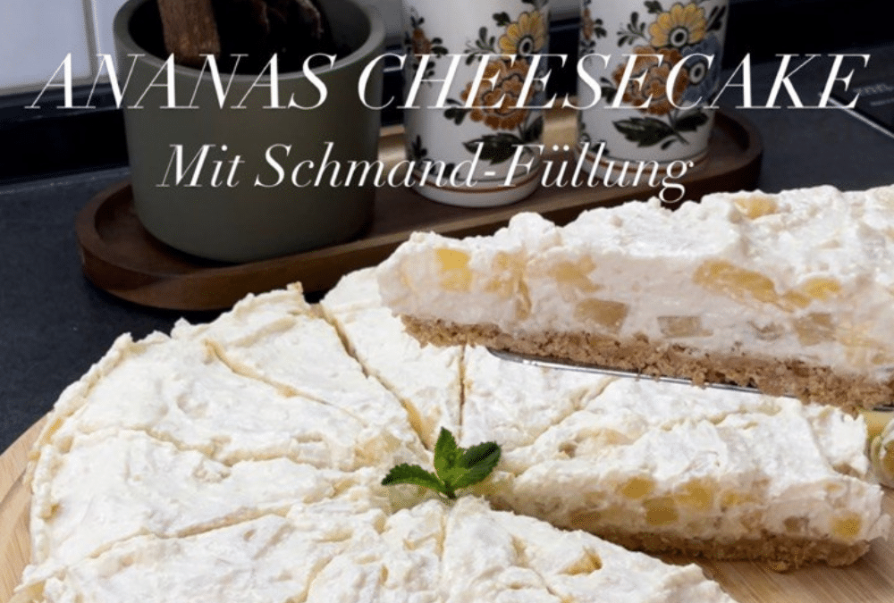 Genieße einen leichten und erfrischenden Ananas-Cheesecake mit Schmandfüllung. Dieser Cheesecake kombiniert die süße Frische der Ananas mit einer zarten und cremigen Schmandfüllung, was ihn zu einem perfekten Dessert macht und nicht schwer im Magen liegt. Die Ananas passt hervorragend zur Geschmeidigkeit des Cheesecakes und sorgt für eine exquisite Geschmacksharmonie. Ideal als süßer Abschluss nach dem Essen oder als besonderes Highlight für das Kaffeekränzchen.