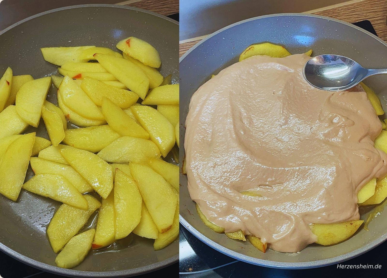 Danach kommt der Teig dazu. Wichtig ist, dass der Teig auf niedriger Stufe und mit geschlossenem Deckel gebacken wird – so bleibt der Kuchen gleichmäßig saftig und geht schön hoch. Einmal hatte ich die Hitze auf mittlere Stufe gestellt, was zu stark war: die Äpfel sind angebrannt und der Teig ist nicht aufgegangen. Daher lieber geduldig auf kleiner Flamme arbeiten, damit dein Apfelkuchen aus der Pfanne perfekt gelingt.