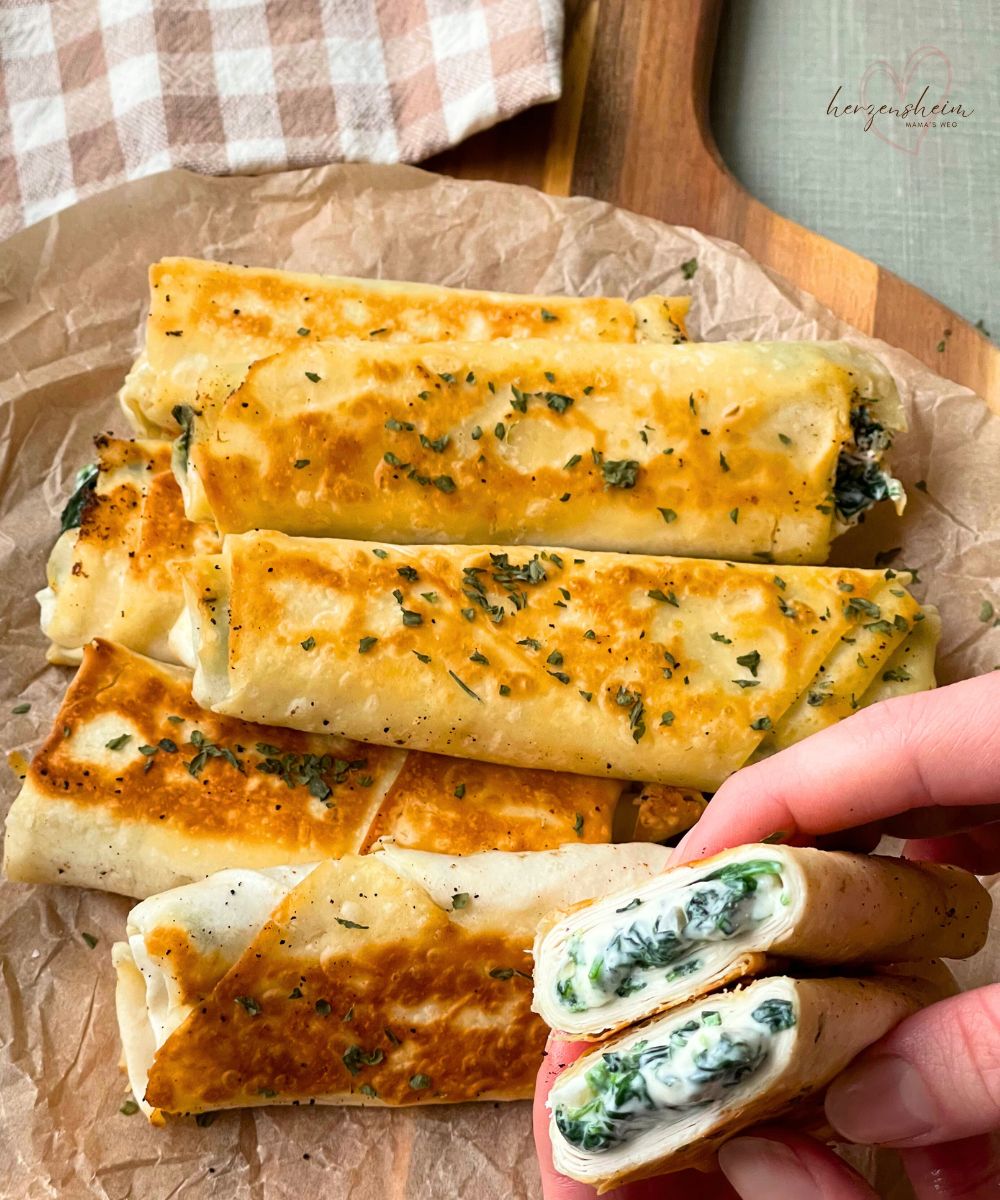 Diese knusprigen Yufka-Röllchen sind echte Allrounder – außen goldbraun gebraten, innen schön cremig. Die Füllung aus Spinat und Frischkäse ist schnell zusammengerührt und bleibt angenehm saftig. Wer es etwas würziger mag, kann noch Fetakäse oder geriebenen Käse dazumischen. Sie schmecken warm genauso gut wie kalt und lassen sich super vorbereiten – ideal also für Picknick, Fingerfood-Buffet oder den kleinen Hunger zwischendurch. In Stücke geschnitten machen sie sich auch super auf einer Platte zum Teilen. Wer mag, kann sie noch mit Kräutern oder etwas Knoblauch verfeinern. Auch ein frischer Joghurt-Dip passt toll dazu. Einfach, lecker und richtig praktisch zum Mitnehmen!