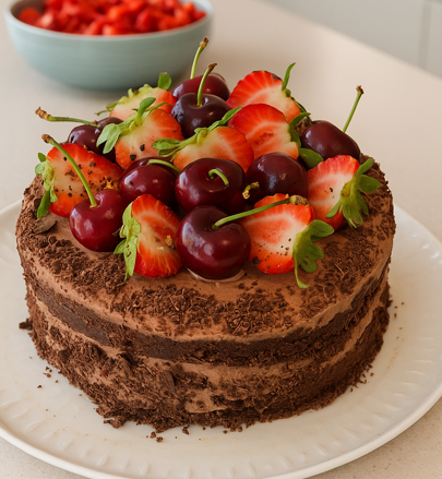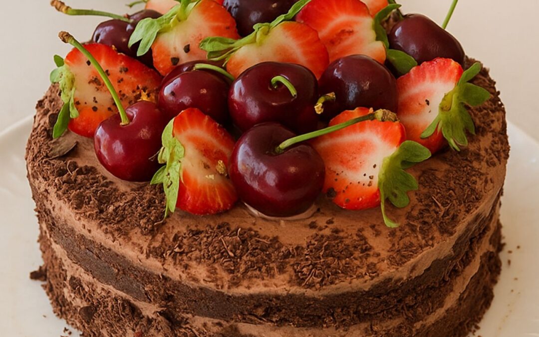 Für die Füllung habe ich eine Mischung aus Erdbeeren und Kirschen genommen – die Kirschen natürlich vorher entsteint und klein geschnitten. Als Topping kamen ganze Kirschen und halbierte Erdbeeren zum Einsatz. Sah richtig schön aus! Zum Schluss hab ich noch etwas Zartbitterschokolade gerieben und an den Seiten und oben auf der Torte verteilt. Das hat das Ganze perfekt abgerundet.