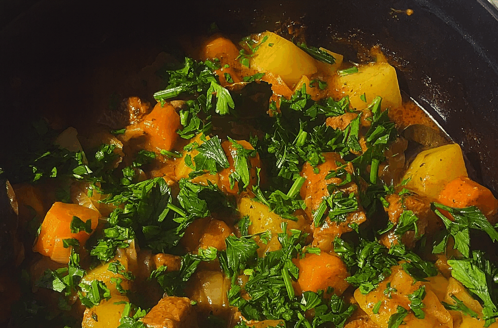 • Das Fleisch und das Gemüse in Würfel schneiden und in einen gusseisernen Topf geben.In einer Schüssel Wasser, etwas Öl und die Gewürze deiner Wahl – ich nehme Salz, Pfeffer, Thymian, edelsüßes Paprikapulver, Mehl und Knoblauch – gut verrühren und über das Fleisch und Gemüse gießen.Den Topf mit dem Deckel verschließen und bei 200 °C Ober-/Unterhitze für ca. 2 Stunden im Ofen schmoren lassen.