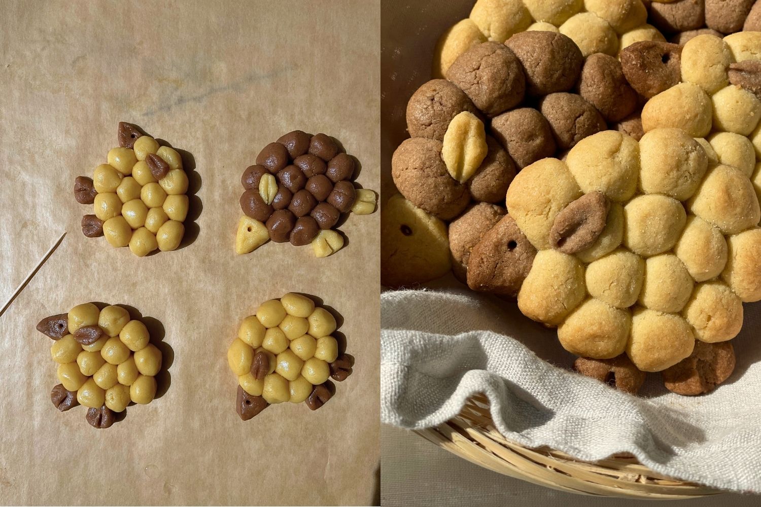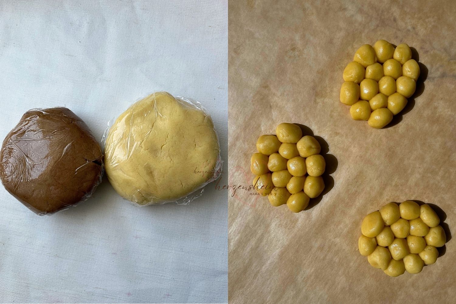 - Für das erste Schäfchen-Design: Aus dem hellen Teig kleine Kugeln rollen und auf dem Backblech so zusammensetzen, dass sie den Körper des Schafes bilden.