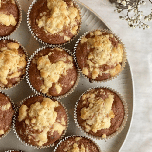 - Jetzt geht's an die Streusel. Vermische alle Zutaten für die Streusel, bis es schön krümelig ist. Diese Krümel verteilst du gleichmäßig auf dem Muffinteig in den Förmchen. Die Muffins lässt du dann bei 200 Grad etwa 15 bis 20 Minuten backen. Nach dem Backen die Muffins abkühlen lassen und dann: Genießen!